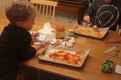 my eldest kid is really into square slices right now, so we went that route and just pressed the dough into a couple parchment-lined quarter sheet trays and let them at it. they did eat many fistfulls of mozzarella and stacks of pepperoni in between each addition to their pies, but the end results were solid.