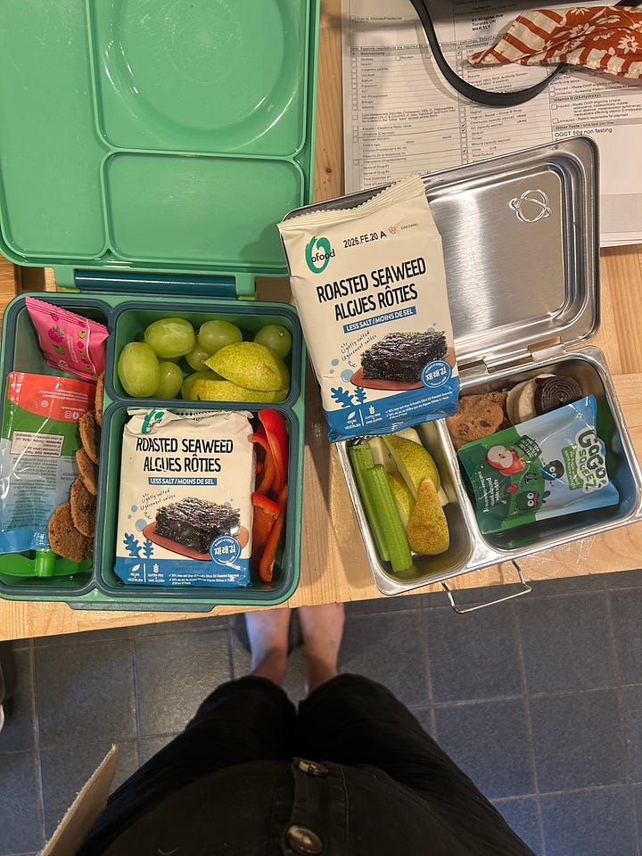 The fruit is usually an apple or a pear or a bunch of grapes, but it’s prune plum season right now so that’s also in the roster while we have them. The veggie is almost always sliced cucumbers, but I’ll try to switch it up if they’ll let me with celery, peppers, carrots, a handful of spinach. If they ask for it I’ll add a little container of ranch or hummus or green goddess dressing (recipe below!) to dip. Something crunchy depends on the kid - I dole out rice crackers, goldfish, seaweed, crunchy edamame, popcorn, veggie straws. Something sweet is usually lunchbox cookies or muffins if I have my shit together, fruit gummies/dried fruit/apple sauce pouch and a honey stick when we’ve got ‘em.